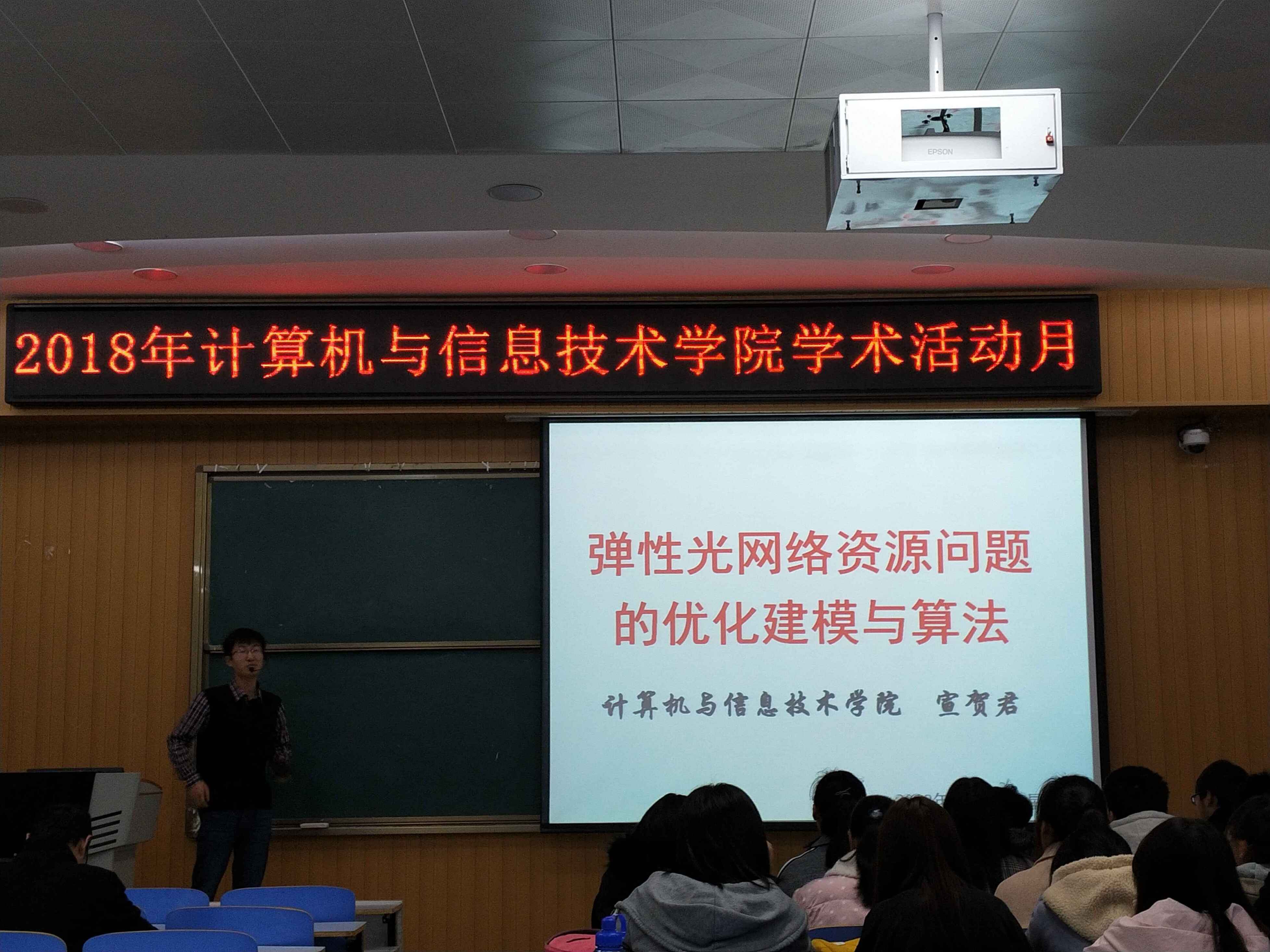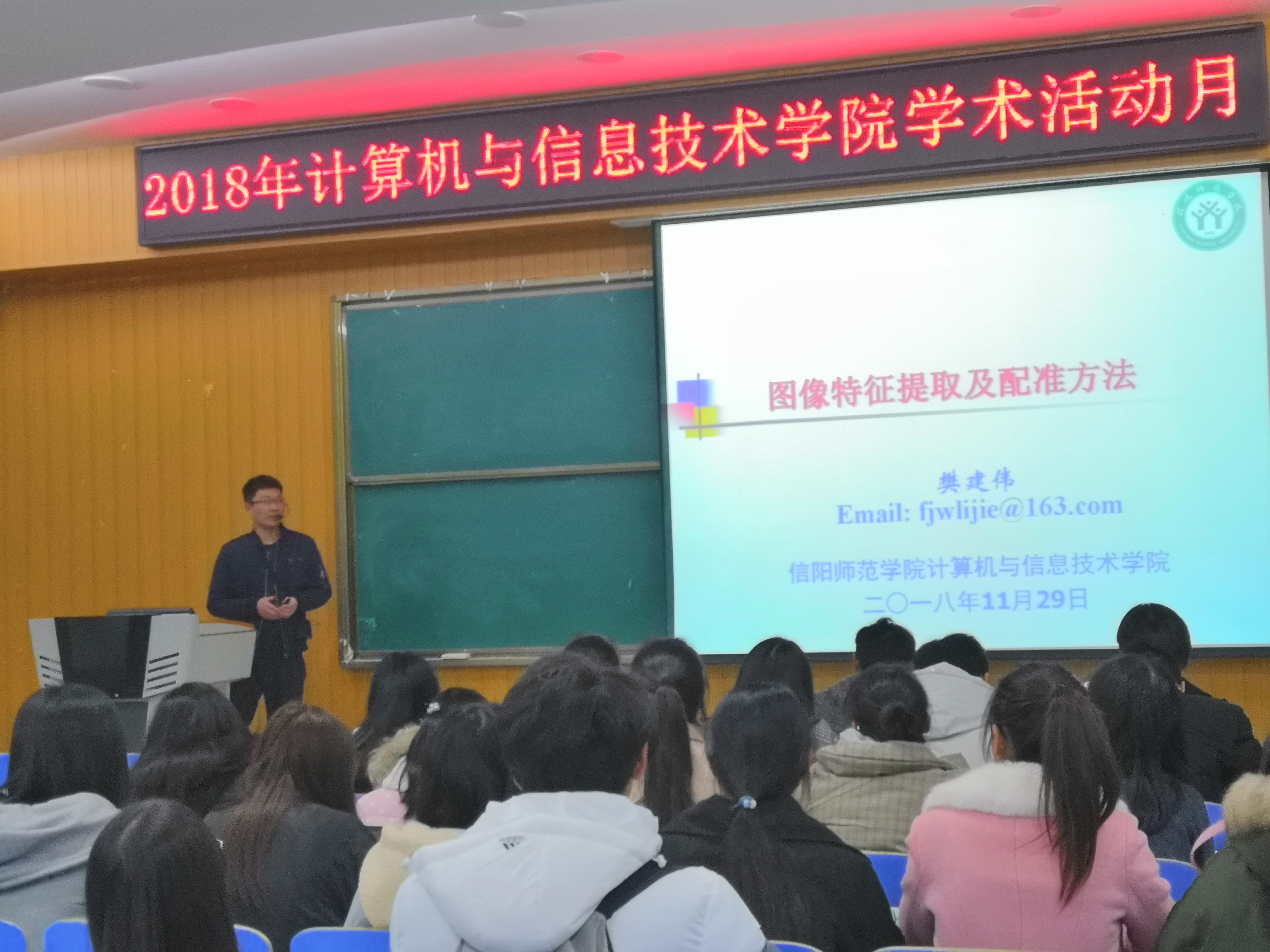 11月29日下午,信阳师范公司best365足球官网樊建伟、宣贺军博士在计算机楼107教室分别作了题为“图像特征提取及配准方法”和“弹性光网络中资源分配问题的优化建模与算法研究”的学术报告。计算机公司副经理黄俊、冯岩和李国梁等公司领导、公司部分教师、全体研究生以及部分本科生参加了报告会。报告会由best365足球官网副经理冯岩主持。