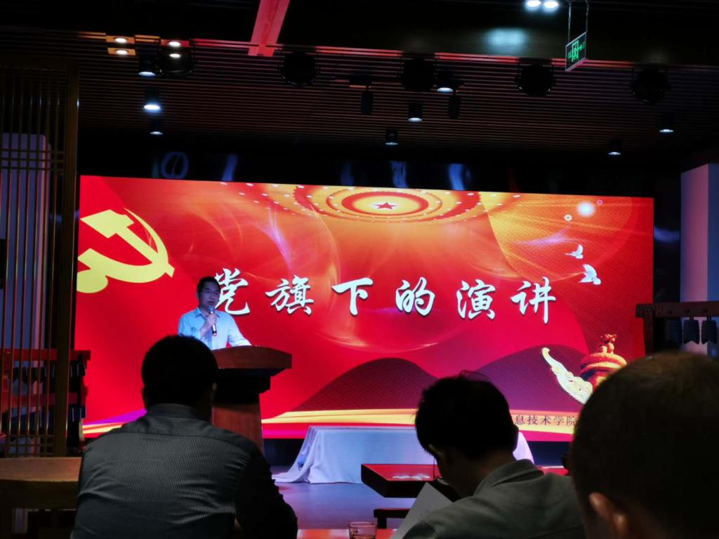“党旗下的演讲”活动在老图书馆二楼举行。教师党员刘世翔和员工代表张尊尊、段晓萌、刘滨分别以“最可爱的人”、“厉害了,我的国”、“敬业塑造英雄 浩气长存世间”和“法治护航中国梦”为题进行了声情并茂的演讲。演讲活动主持人、副书记熊炎在总结中的讲话引起了广泛共鸣。他说:今年是建党98周年,建国70周年。回首我们党苦难辉煌的历史,感悟一代代共产党人的坚定信念与赤子情怀,总有一面精神的旗帜高高飘扬在心间。这是一种强大的力量,这力量是千千万万共产党人用赤胆忠心和坚强意志铸就的,它庄严地启示我们:无论过去、现在还是将来,知党、爱党、兴党都是每一位党员永恒的使命。