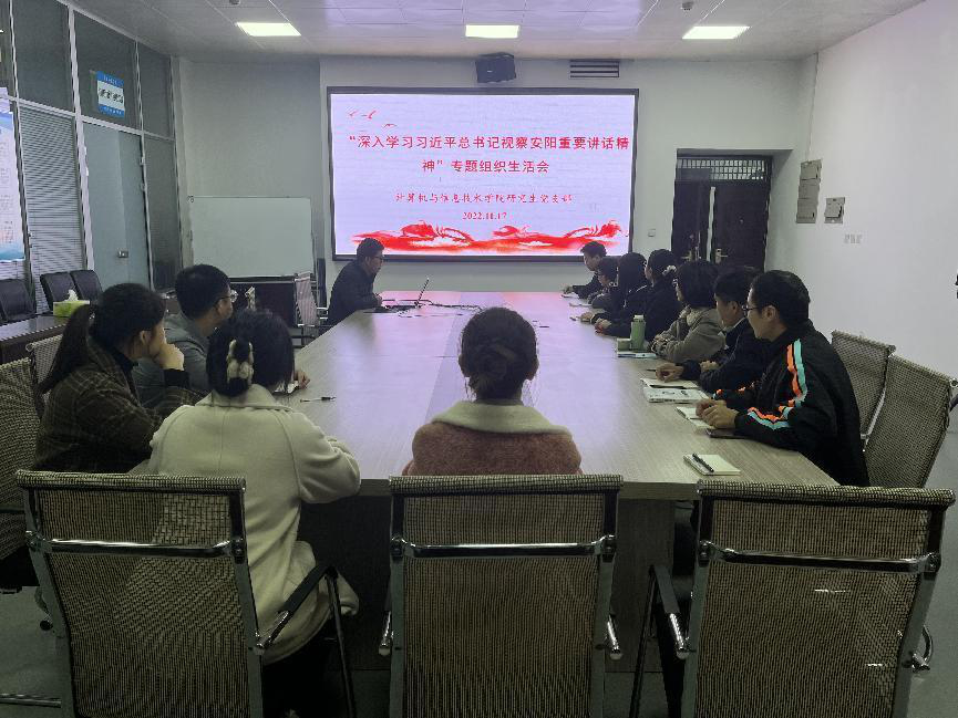 11月17日下午17点,公司研究生党支部在计科楼203会议室召开“深入学习习近平总书记视察安阳重要讲话精神”专题组织生活会,研究生党支部全体党员参加,会议由支部书记李健主持。