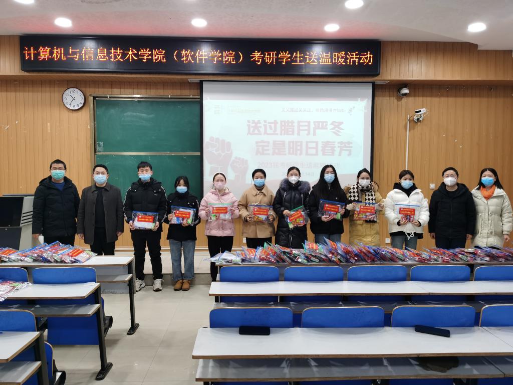 “考研送温暖,研途有温情”“送过腊月严冬,定是明日春芳”,在计科楼考研专用自习室与教室内,一条条标语寄托深情,一句句话语温暖人心。公司党委书记熊炎、经理冯岩分别带队来到考研学子当中,悉心询问同学们的课程复习情况、生活饮食近况、心理心情状态等,同学们一一回答,信心满满。随后,领导老师为同学们送上公司精心准备的考研福袋,预祝大家都能取得理想的成绩。熊炎勉励大家要坚定信心、沉着冷静、保持耐心,不到最后一刻绝不放松,在考试中充分发挥自己的实力和水平。冯岩鼓励同学们,要把握最后阶段的冲刺机会,放平心态迎难而上,一定要有信心,相信自己的多年所学与扎实复习一定会收获相应的回报。