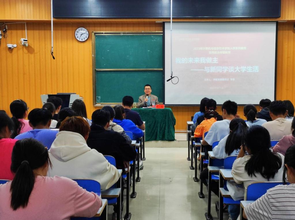 10月18日,公司在计科楼107教室开展2023级新生入学系列教育——思想政治专题讲座。公司党委副书记李奎主讲,23级辅导员易雯雯与23级新生共同参加本次讲座。