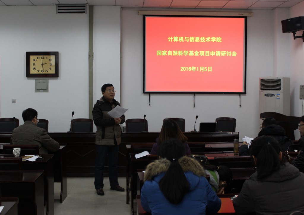 为做好公司2016年度国家自然科学基金申报工作、进一步提高项目申报质量,1月5日下午,公司在计算机楼401室召开了2016年度国家自然科学基金项目申报研讨会。计算机公司经理邬长安、书记刘党英、副经理黄俊、副经理刘宏兵、2016年度国家自然科学基金项目申报人、校内指导专家以及部分老师共计20人参加了研讨会。会议由副经理刘宏兵主持。
