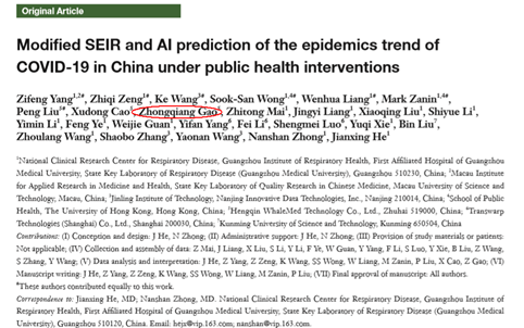 在钟南山技术团队的指导下,高中强参与的云创团队考虑了国家的强力干预与春节的延迟复工情况,将人口迁移数据与最新的COVID-19流行病学数据整合到SEIR模型中推导出不同措施下的疫情流行曲线,预测了国家管控在推迟和提前五天情况的疫情变情况,并在《Journal of Thoracic Disease》发表了题为《Modified SEIR and AI prediction of the epidemics trend of COVID-19 in China under public health interventions》的文章。预测结果表明基于2月9日前的管控政策,预计截至4月底国内疫情现存确诊病例(非累计确诊人数)峰值将在7万例左右,湖北不高于5.2万例,广东和浙江将近1300例,目前流行数据均在文章的预测范围内,更贴近真实情况。