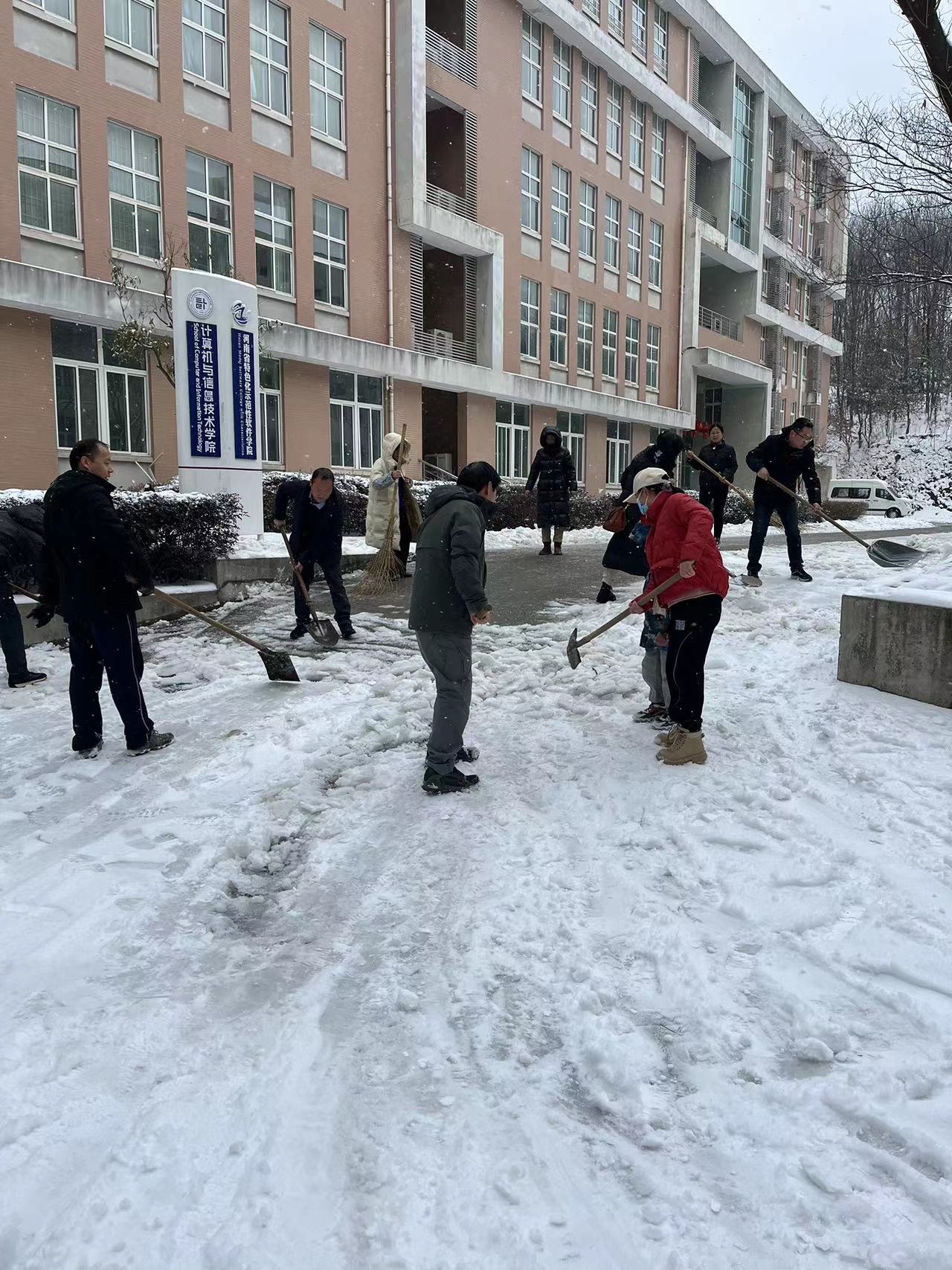 过年前后受降雪天气影响,计算机楼附近道路、停车场积雪结冰,给师生到公司工作带来许多不便。为了给公司师生营造一个安全、便利、温馨的环境,公司两次积极组织部分教职工第一时间投入到扫雪除冰志愿服务行动中,全力以赴保障计算机楼附近道路的安全畅通。