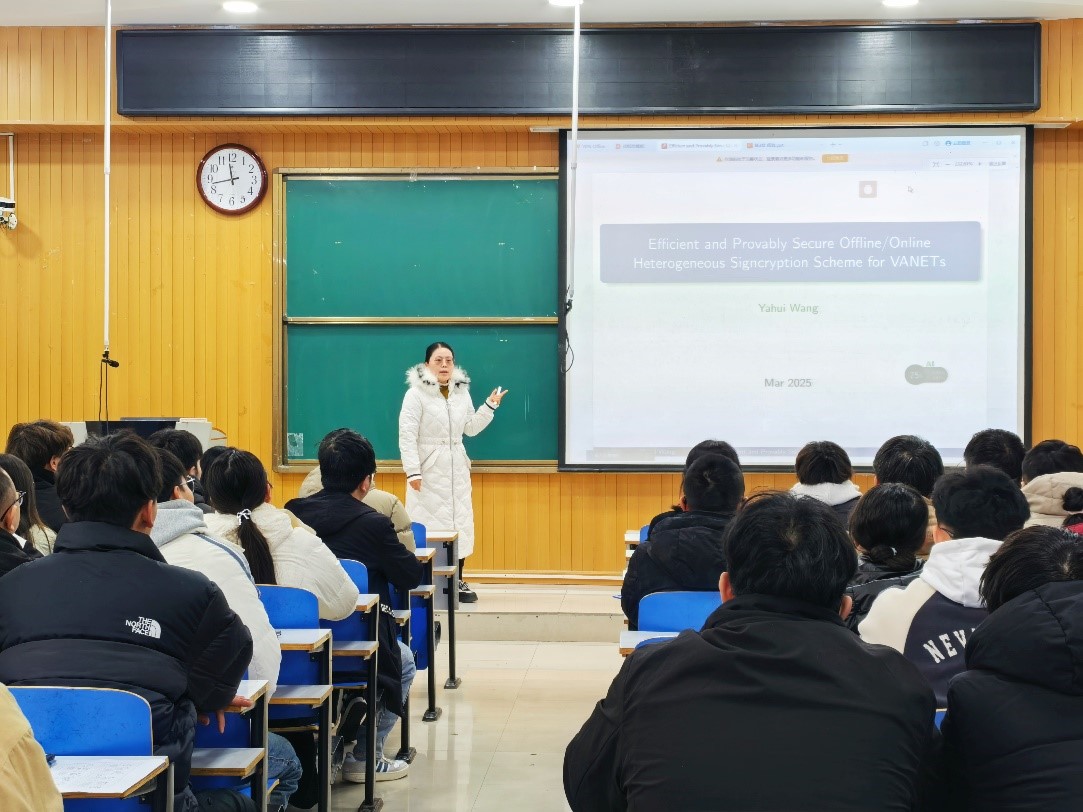 报告中,王亚辉博士介绍了一种高效可证明安全的在线/离线异构签密方案的详细设计理念和技术细节。她指出,随着无线通信与自动驾驶技术的迅猛发展,车载自组织网络(VANETs)已成为提升道路交通安全和效率的关键技术。然而,车辆在高速行驶时与路边基础设施的安全通信问题亟待解决。该方案旨在无证书加密(CLC)环境中的车辆与基于身份加密(IBC)环境中的路边单元(RSU)之间实现保密性、完整性和身份匿名性的同时传输。安全证明和性能分析表明,该方案在计算和通信成本方面优于其他方案,特别适用于异构系统的通信场景。相关成果已发表于国际权威期刊《IEEE Internet of Things Journal》。